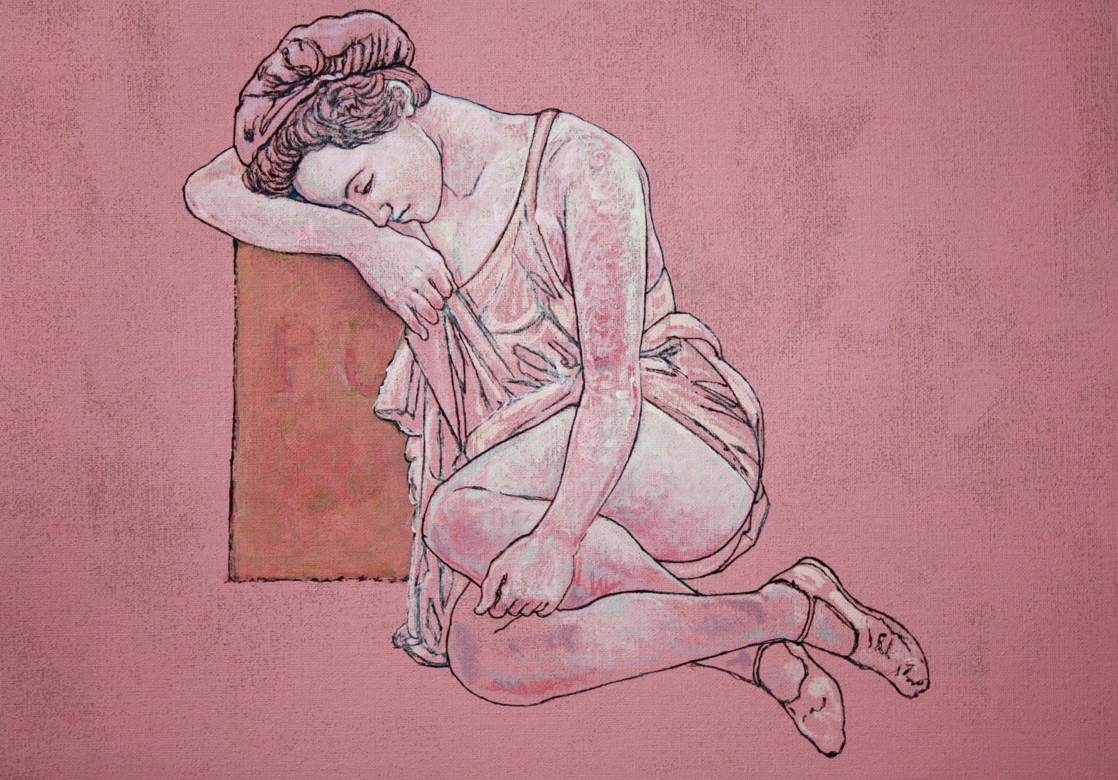 This painting is inspired by one of the most represented episodes of the Trojan War. Aeneas fleeing the sack of Troy with Anchises, his father, and his son Ascanius. It is a tribute to my grand-father who had to flee Barcelona in 1939 and who was interned in a refugee camp in France. Aeneas’ mother, the goddess Aphrodite, is painted from a photograph of Gerda Taro taken by Robert Capa during the Spanish Civil War. The hare, ready to run away, produces an alienation effect which suggests the transitory quality of human tragedies in front of Nature’s permanence.